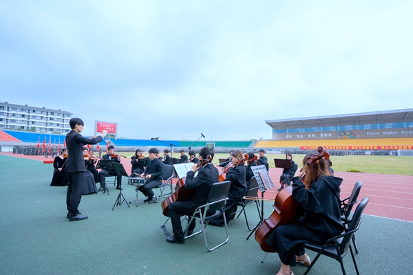 军训表演中,音乐学院管弦乐团的师生们带来了红色乐曲演奏《钢铁洪流进行曲》。激昂的旋律仿佛再现了钢铁雄师一往无前的豪迈气魄,让军训场上的同学们热血沸腾,心中涌起强烈的爱国之情和民族自豪感,激励着大家以更加坚定的信念和昂扬的斗志,迈向未来的学习与生活。